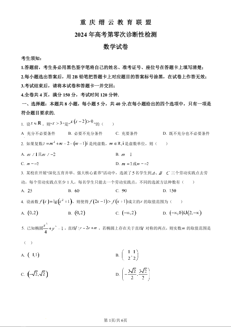 重庆市缙云教育联盟2024届高三上学期第零次诊断性检测数学(原卷版)