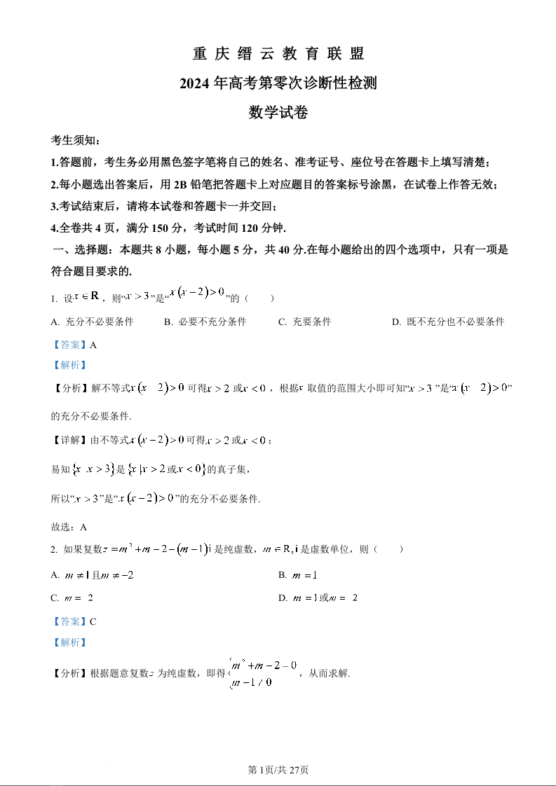 重庆市缙云教育联盟2024届高三上学期第零次诊断性检测数学(精品解析版)