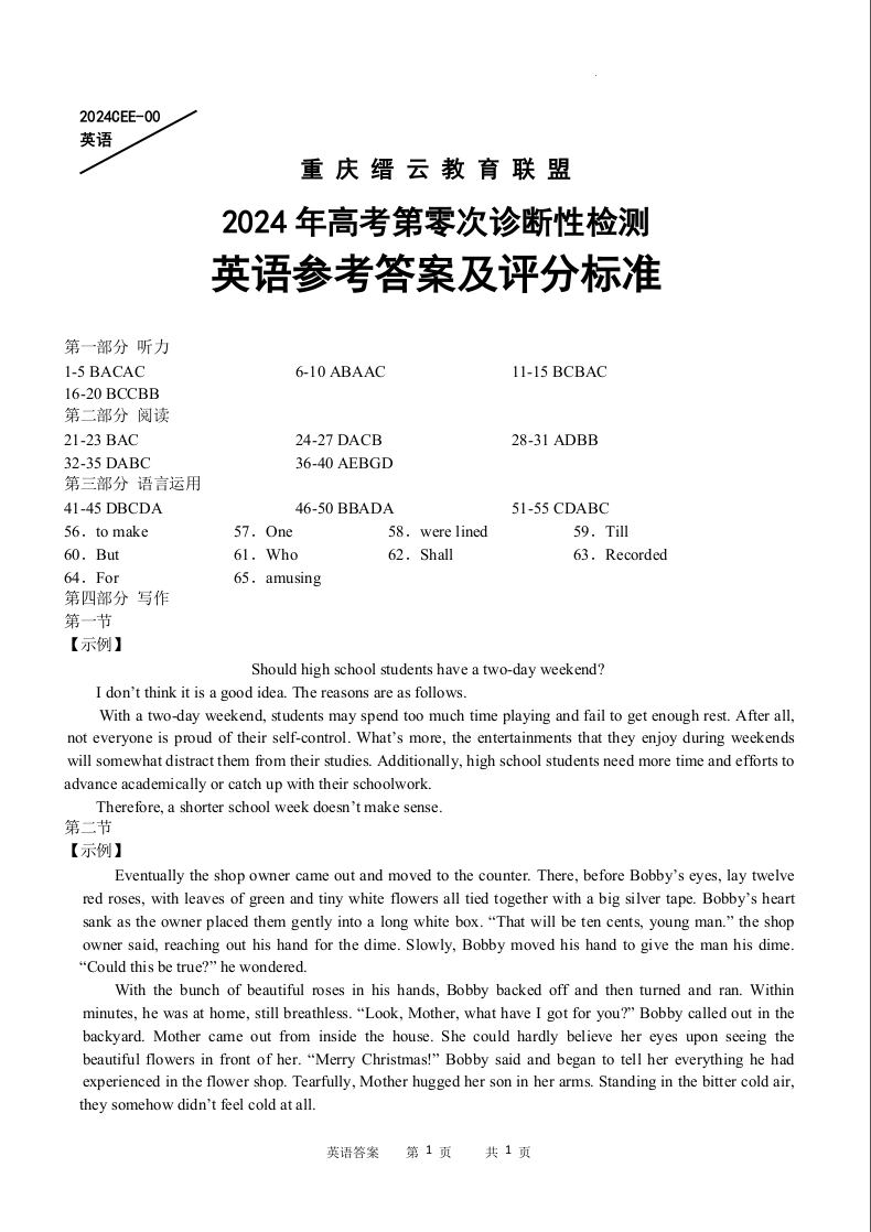 重庆市缙云教育联盟2024届高三上学期第零次诊断性检测英语答案