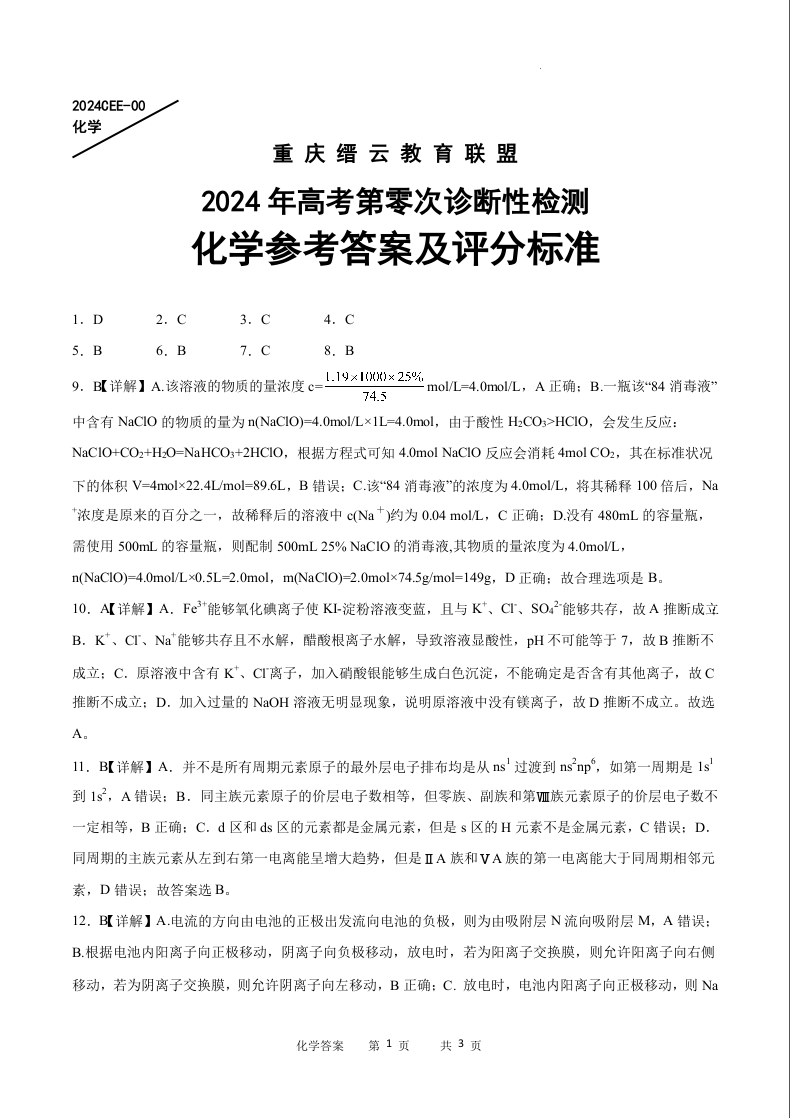 重庆市缙云教育联盟2024届高三上学期第零次诊断性检测化学答案