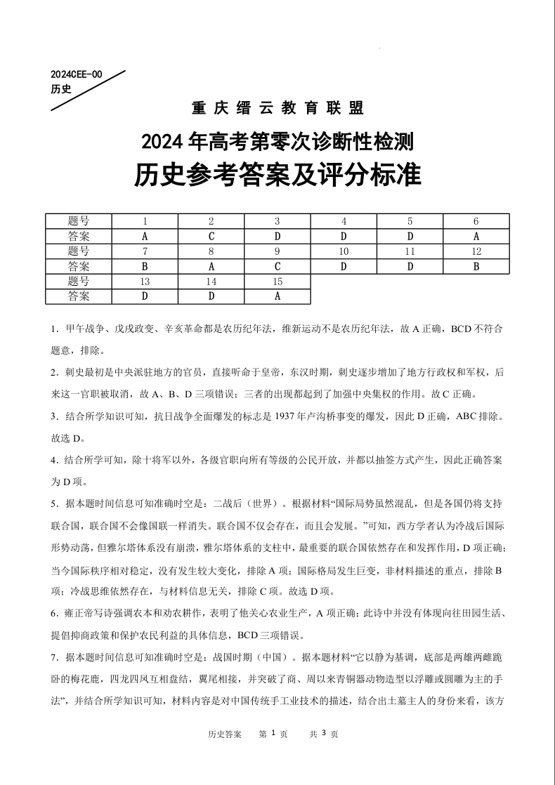 重庆市缙云教育联盟2024届高三上学期第零次诊断性检测历史答案