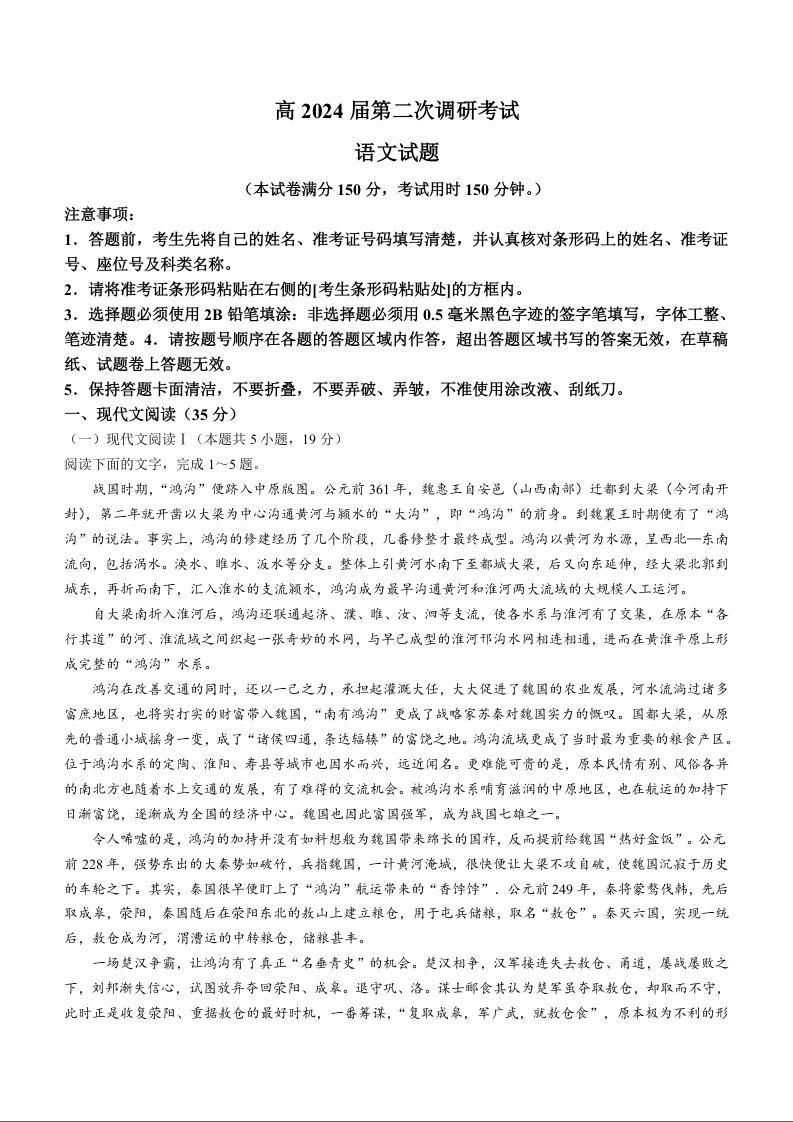 重庆市梁平区2024届高三上学期第二次调研考试语文+答案