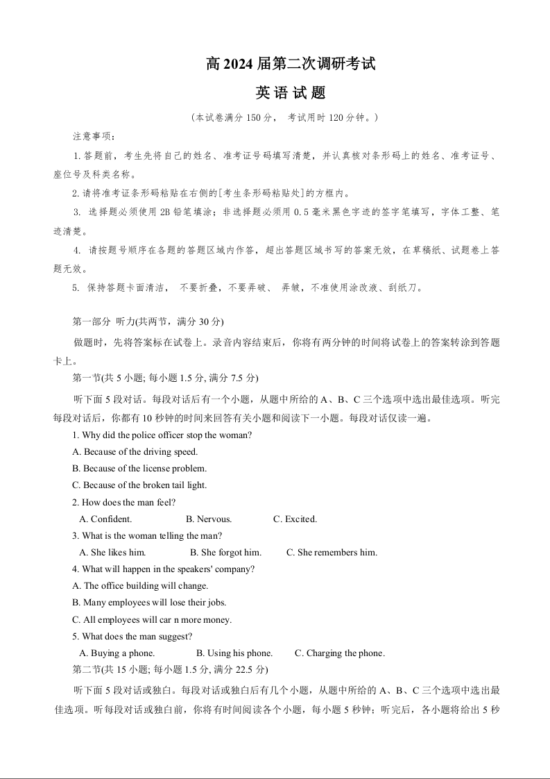重庆市梁平区2024届高三上学期第二次调研考试英语