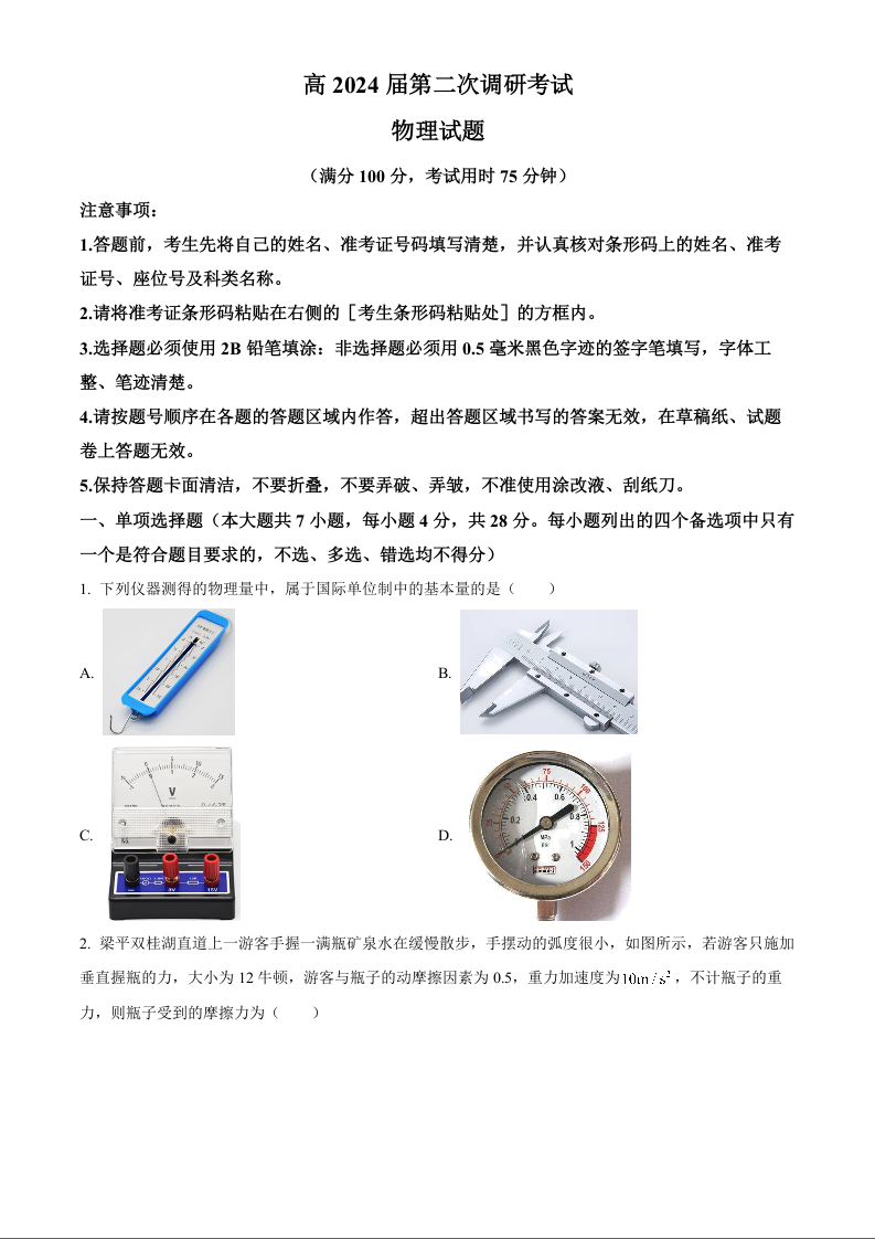 重庆市梁平区2024届高三上学期第二次调研考试物理+答案