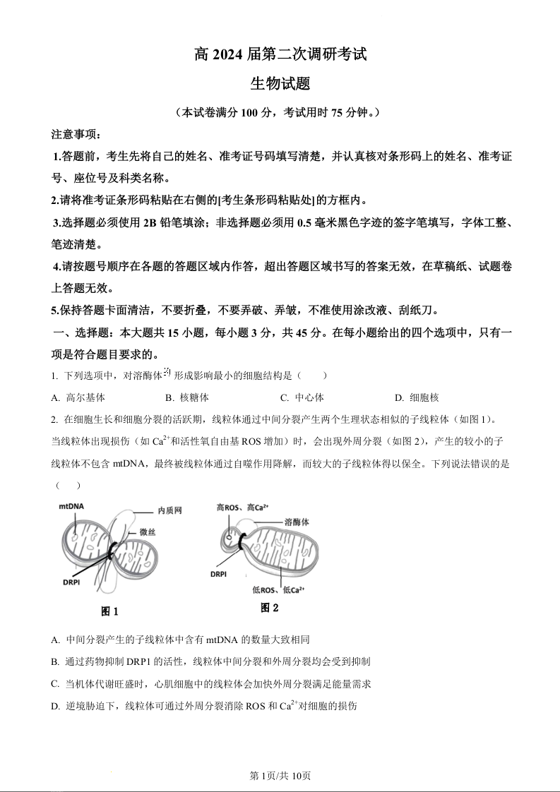 重庆市梁平区2024届高三上学期第二次调研考试生物(原卷版)