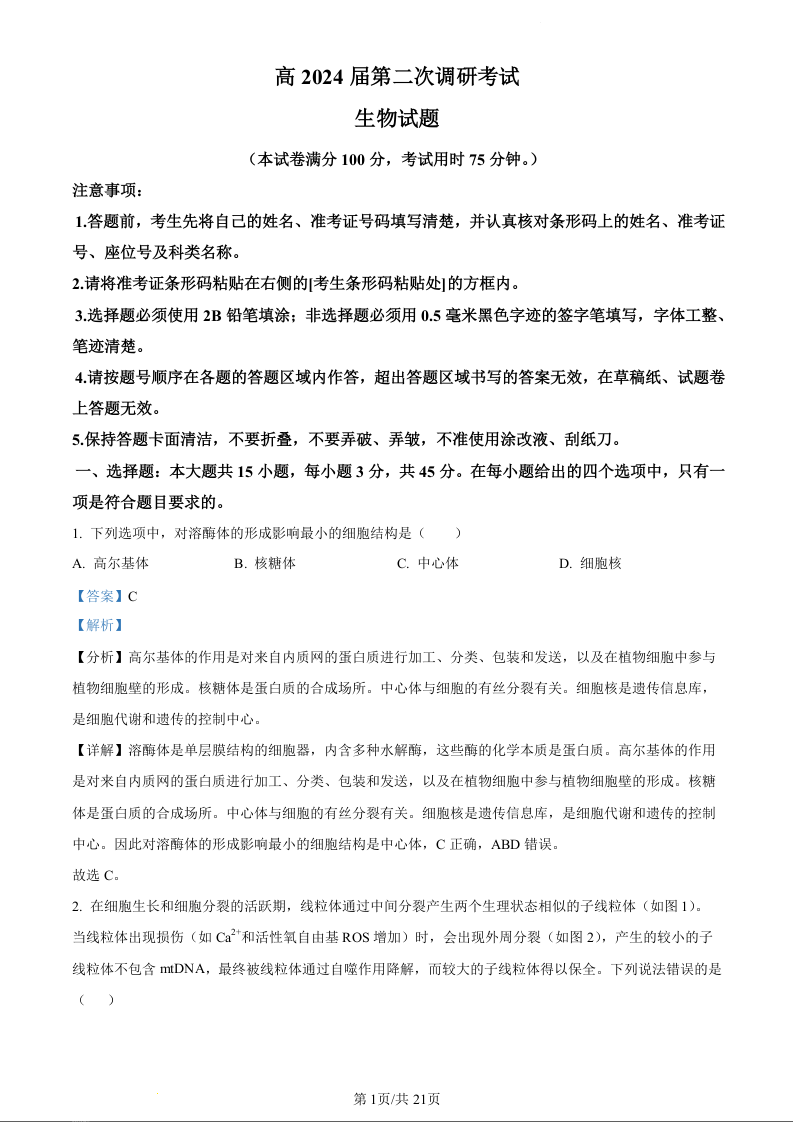 重庆市梁平区2024届高三上学期第二次调研考试生物(精品解析版)