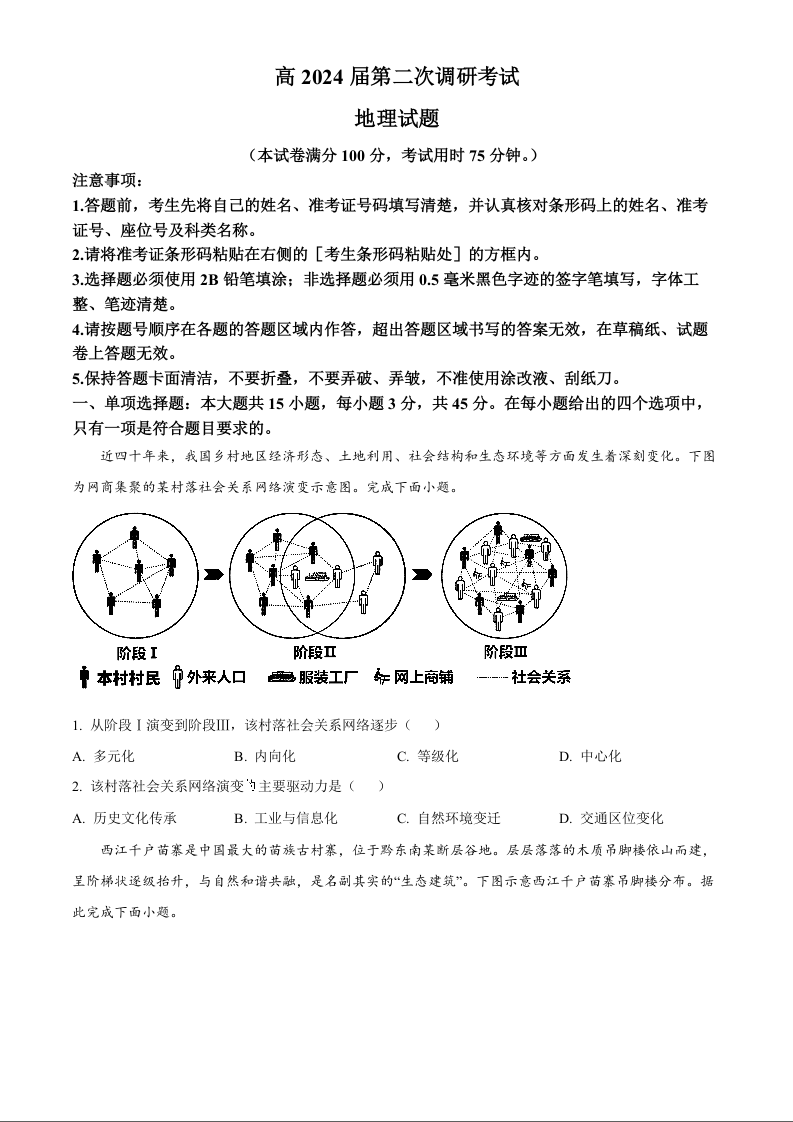 重庆市梁平区2024届高三上学期第二次调研考试地理+答案