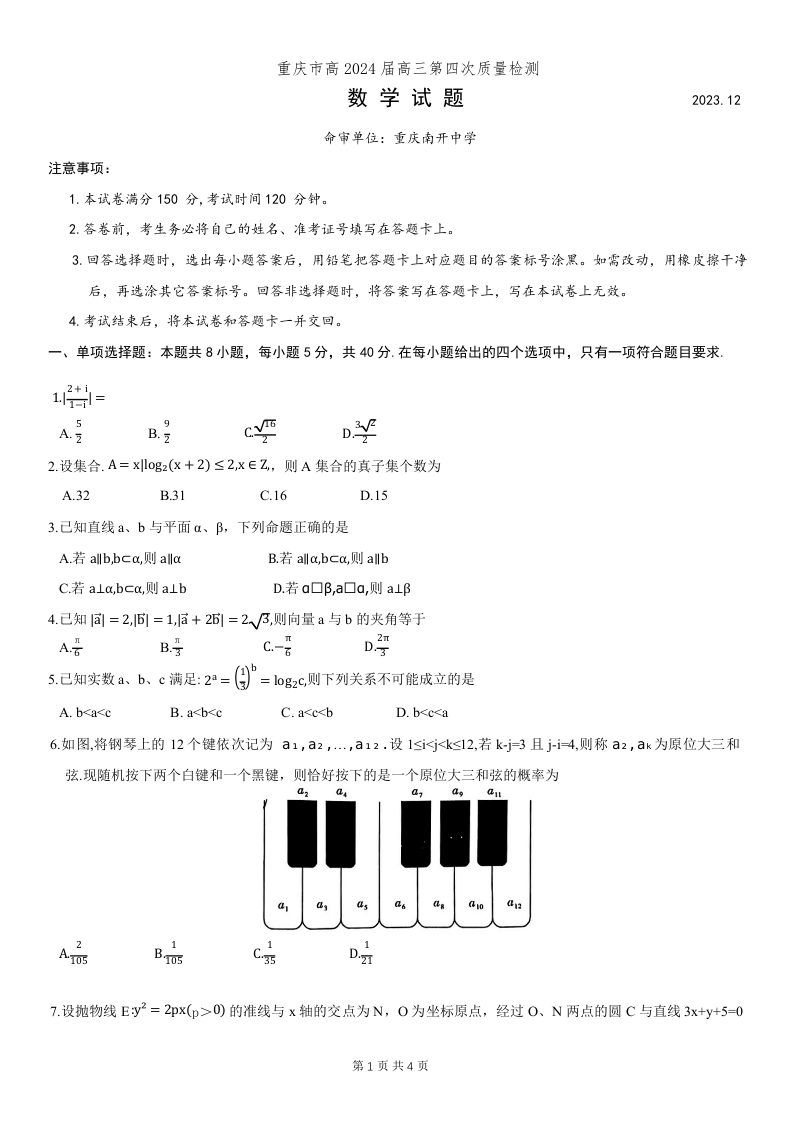重庆市南开中学2024届高三第四次质量检测数学
