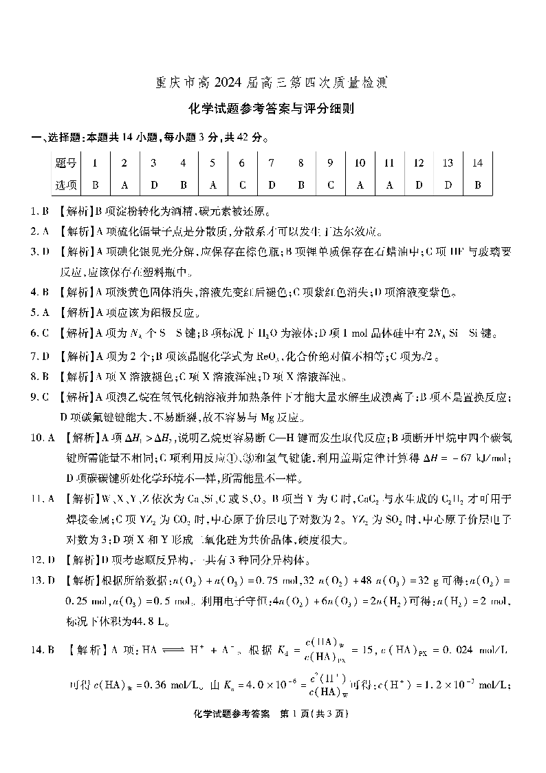 重庆市南开中学2024届高三第四次质量检测化学答案