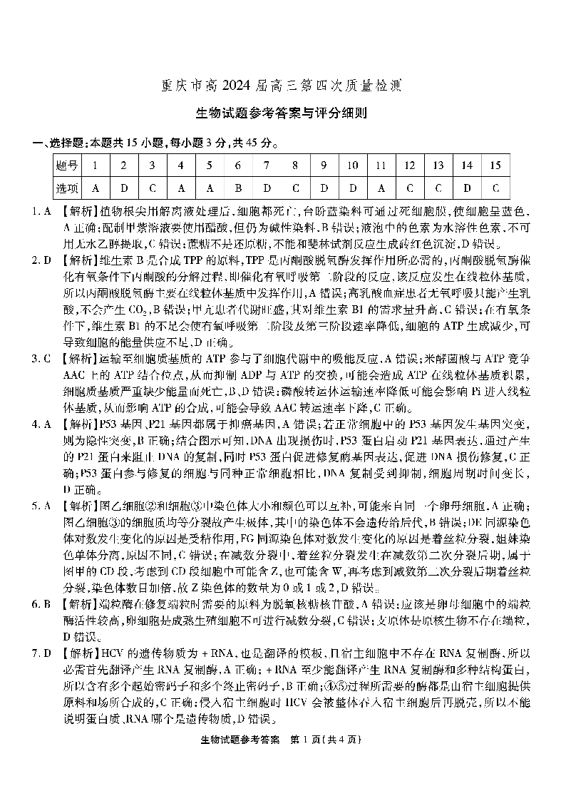 重庆市南开中学2024届高三第四次质量检测生物答案