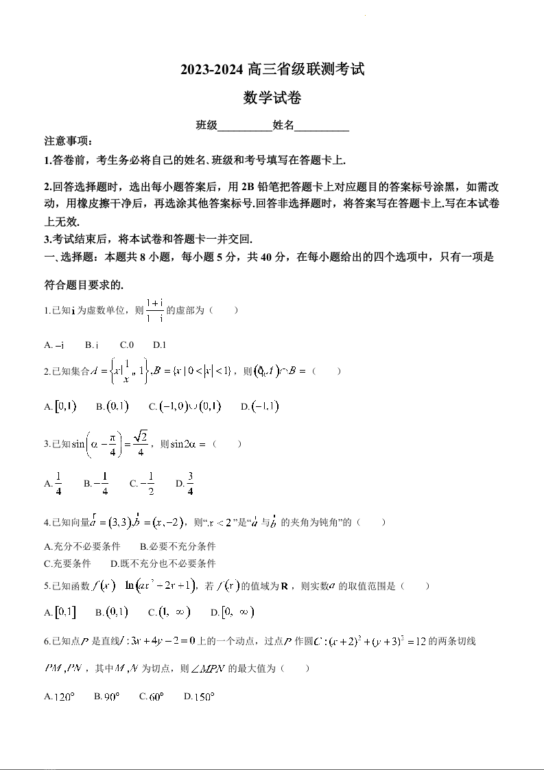 河北省省级联测考试2024届高三上学期12月月考数学+答案