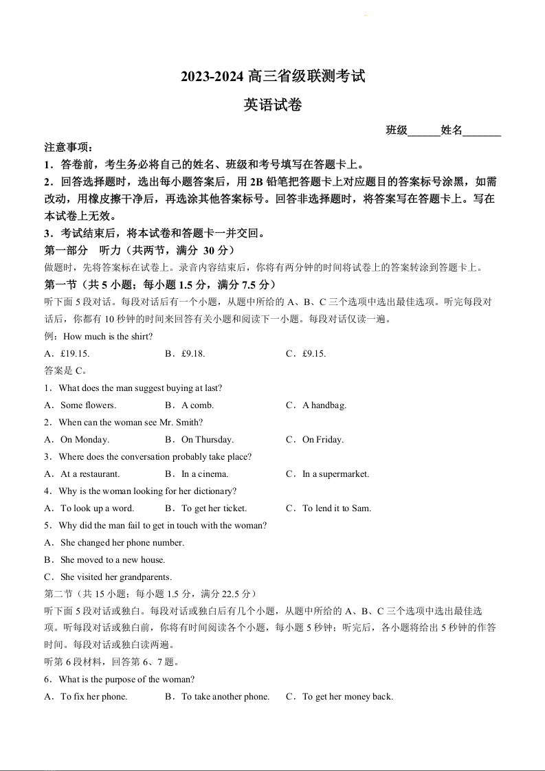 河北省省级联测考试2024届高三上学期12月月考英语+答案