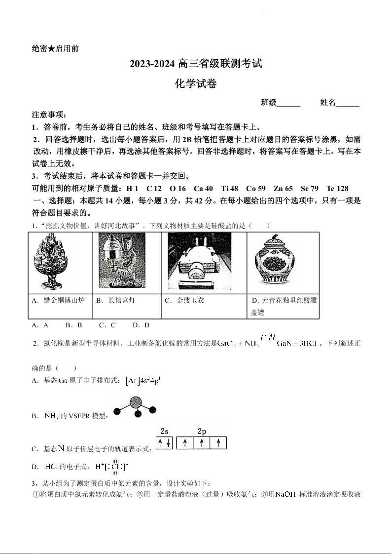 河北省省级联测考试2024届高三上学期12月月考化学+答案