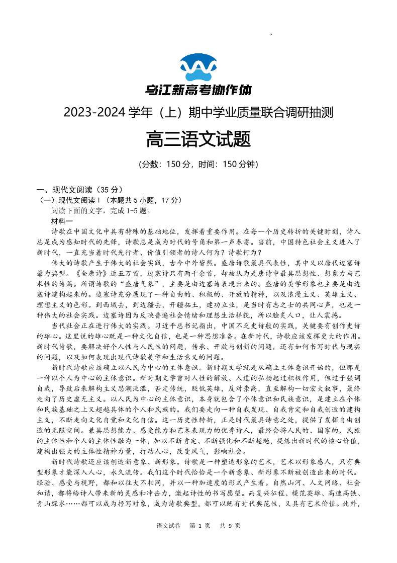 重庆市乌江新高考协作体2024届高三期中学业质量联合调研抽测语文