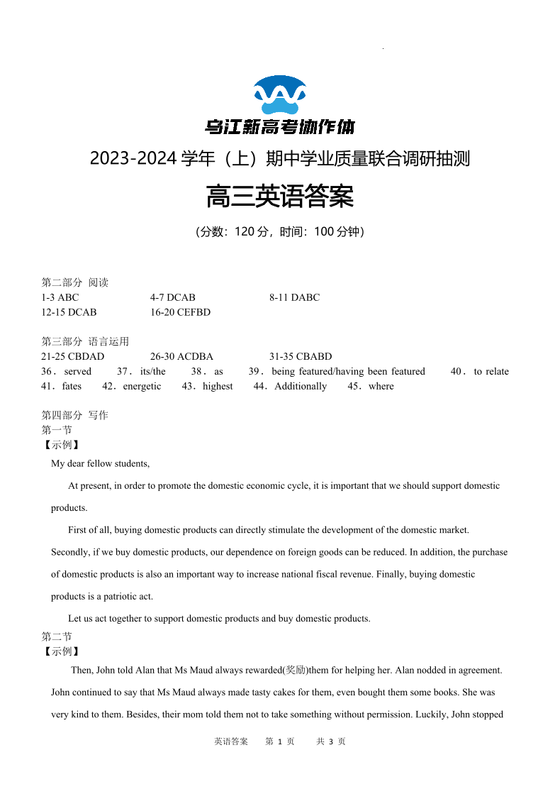 重庆市乌江新高考协作体2024届高三期中学业质量联合调研抽测英语答案