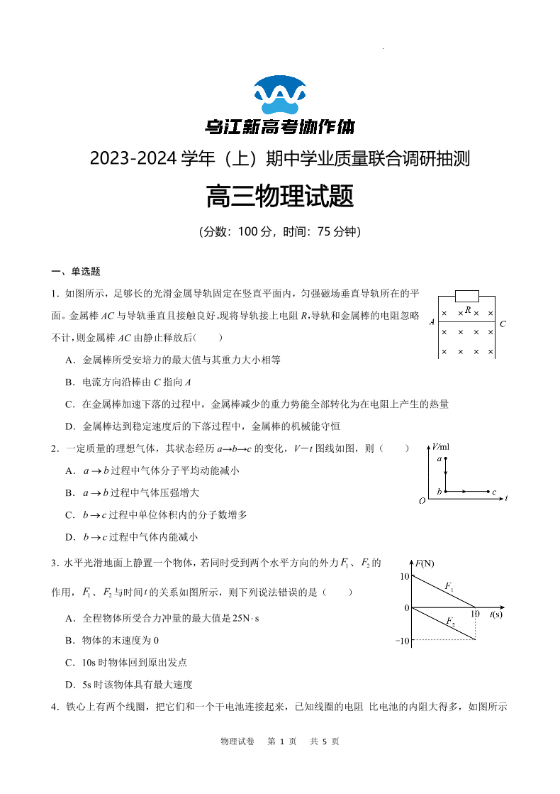 重庆市乌江新高考协作体2024届高三期中学业质量联合调研抽测物理