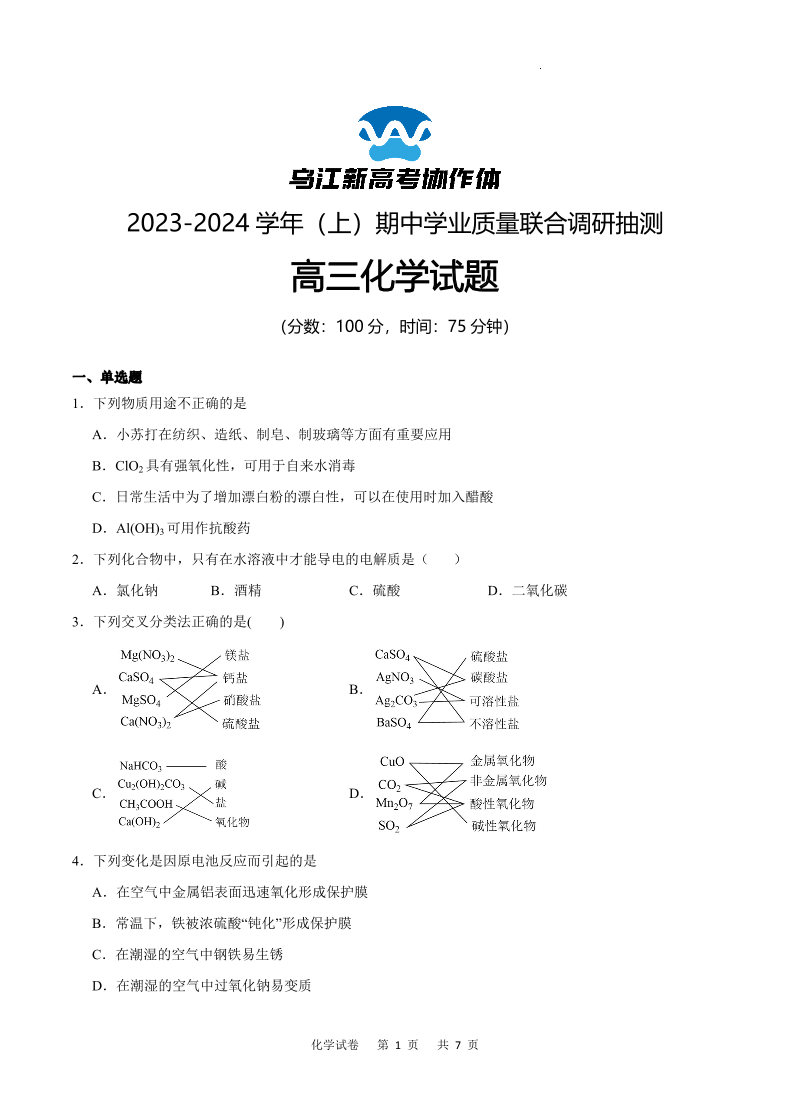 重庆市乌江新高考协作体2024届高三期中学业质量联合调研抽测化学