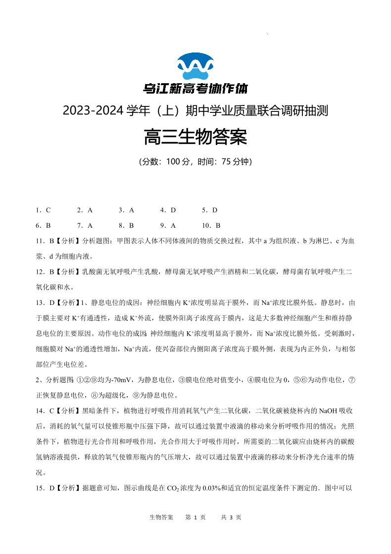 重庆市乌江新高考协作体2024届高三期中学业质量联合调研抽测生物答案