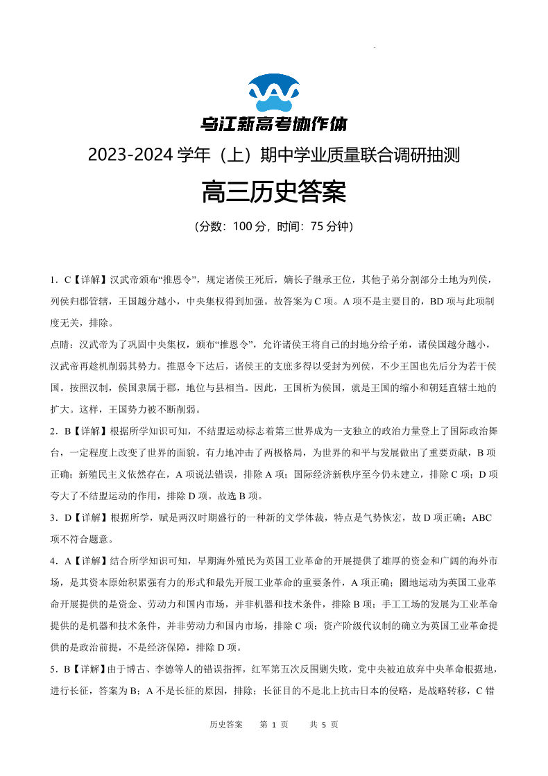 重庆市乌江新高考协作体2024届高三期中学业质量联合调研抽测历史答案