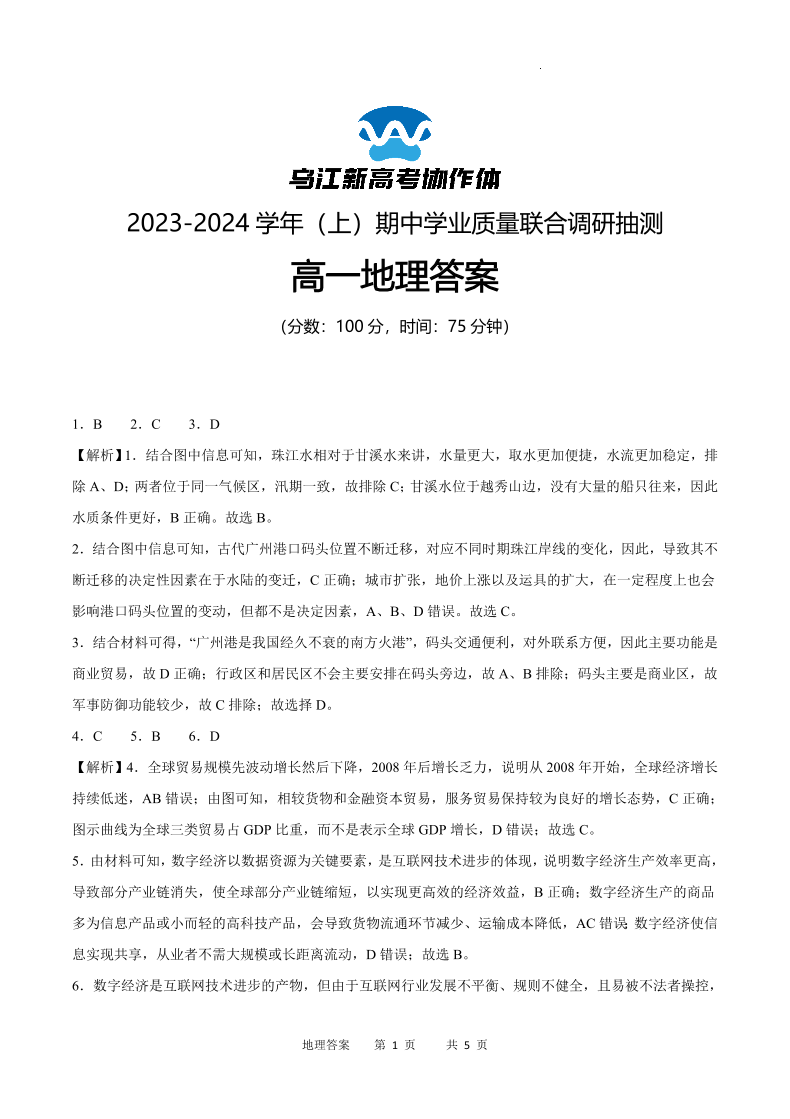 重庆市乌江新高考协作体2024届高三期中学业质量联合调研抽测地理答案