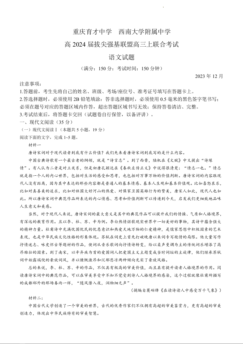 重庆市西南大学附中重庆育才中学2024届高三上学期12月月考语文