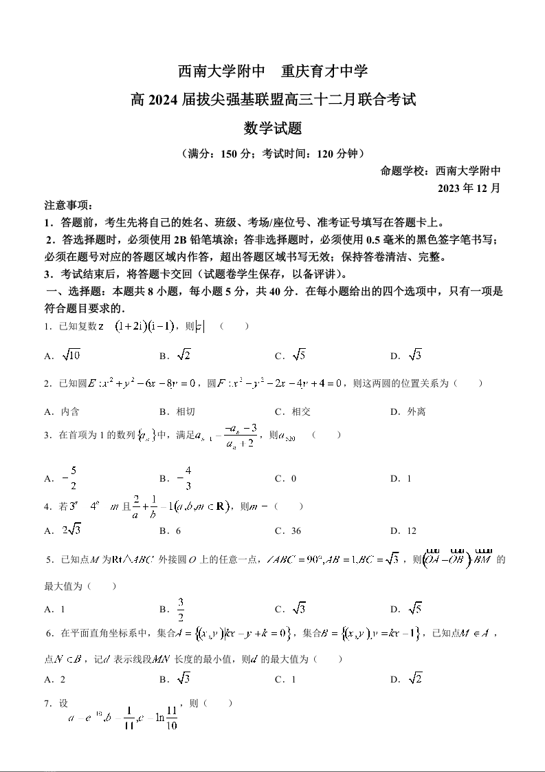 重庆市西南大学附中重庆育才中学2024届高三上学期12月月考数学+答案
