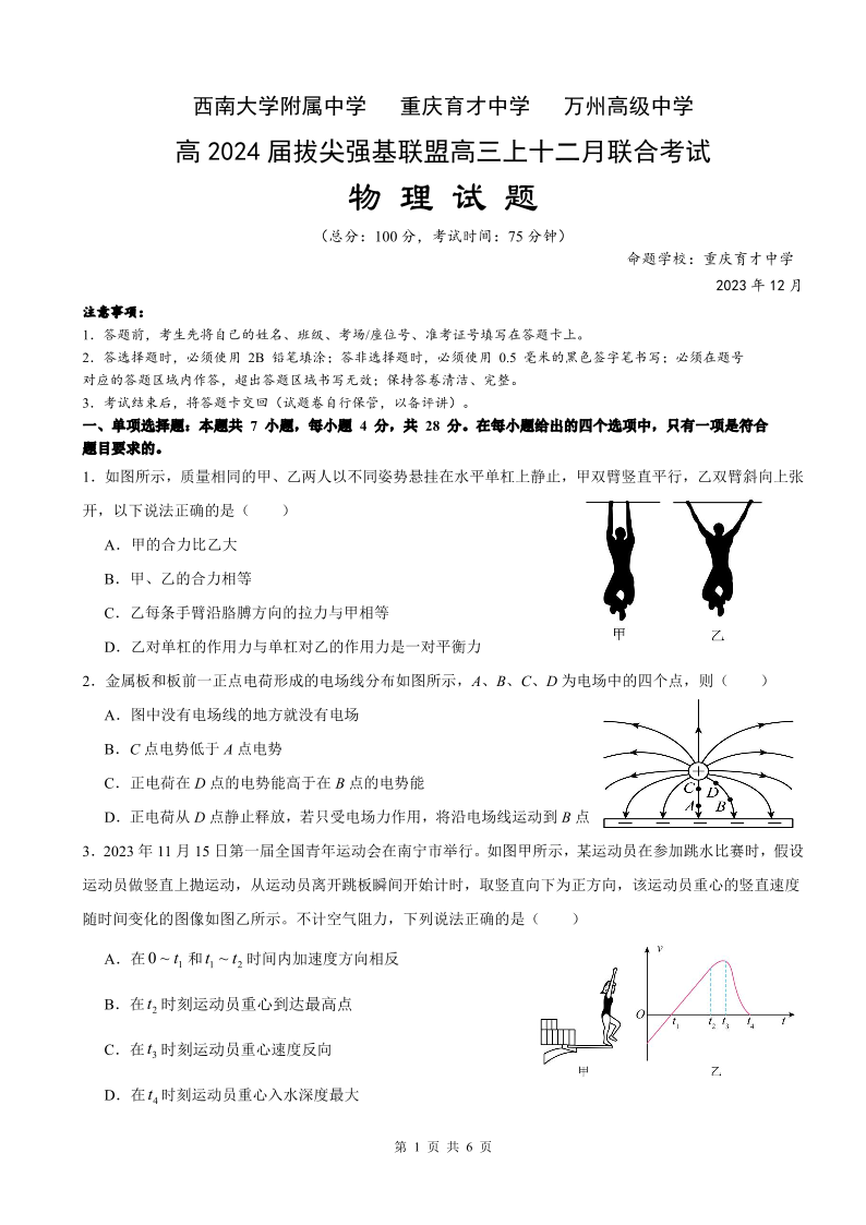 重庆市育才中学、万州高级中学、西南大学附属中学2024届高三12月联考物理