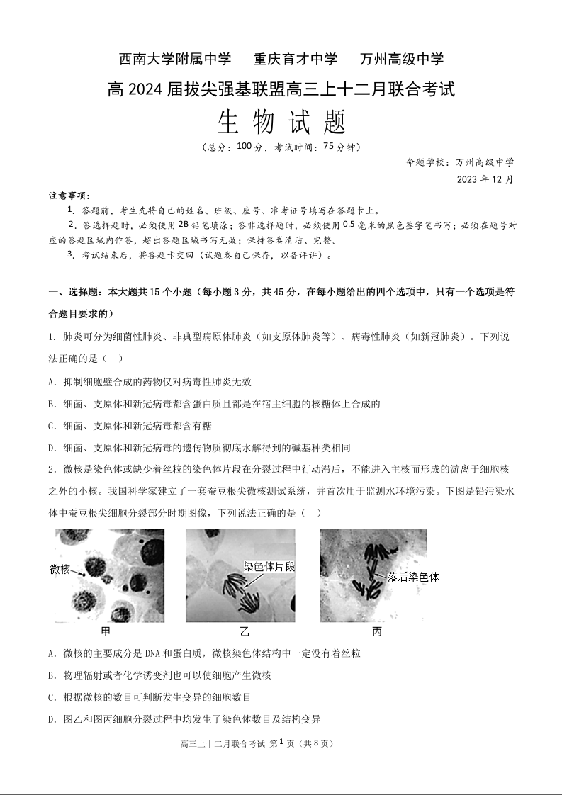 重庆市育才中学、万州高级中学、西南大学附属中学2024届高三12月联考生物