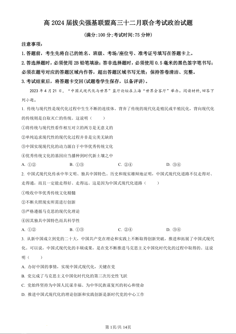 重庆市育才中学、万州高级中学、西南大学附属中学2024届高三12月联考政治+答案