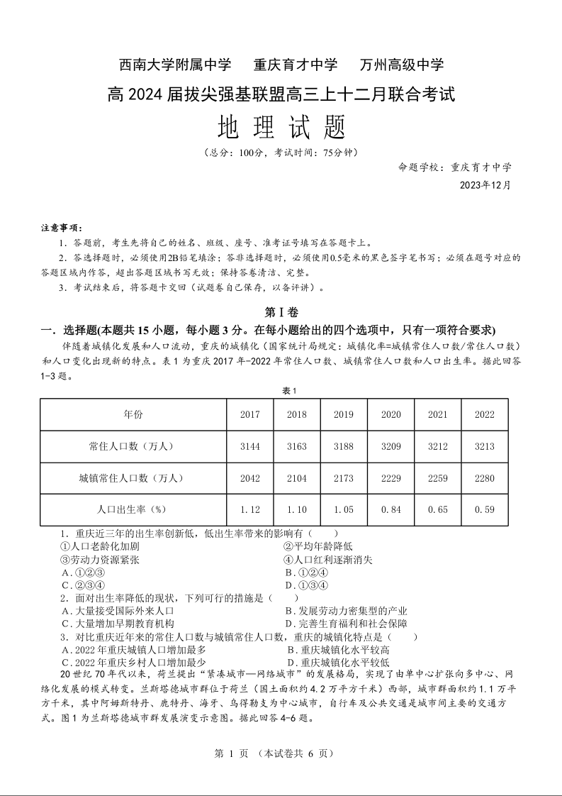 重庆市育才中学、万州高级中学、西南大学附属中学2024届高三12月联考地理