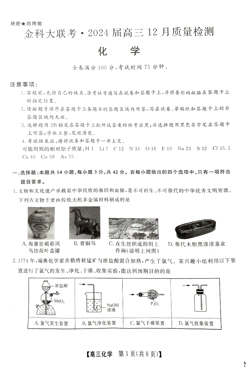 河北省金科大联考2024届高三上学期12月质量检测化学