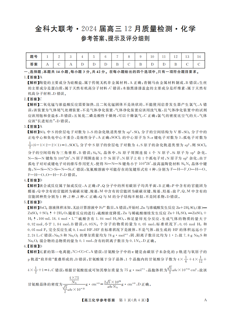 河北省金科大联考2024届高三上学期12月质量检测化学答案