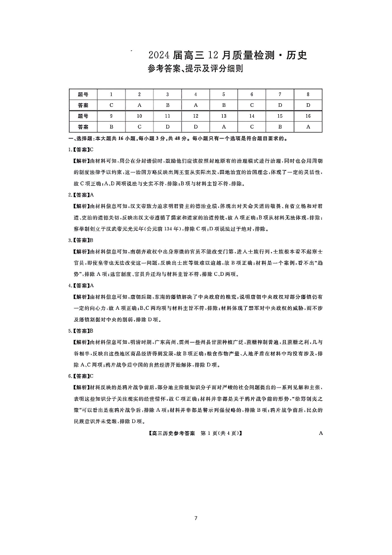 河北省金科大联考2024届高三上学期12月质量检测历史答案