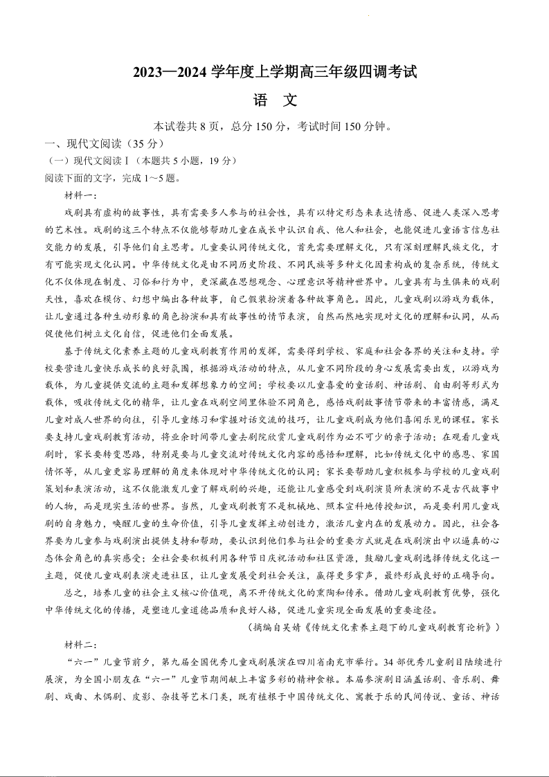 河北省衡水中学2024届高三上学期四调考试语文+答案