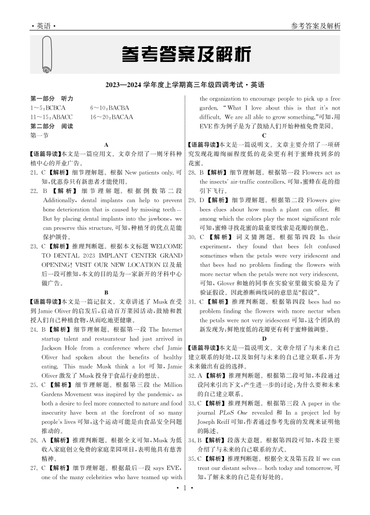 河北省衡水中学2024届高三上学期四调考试英语答案