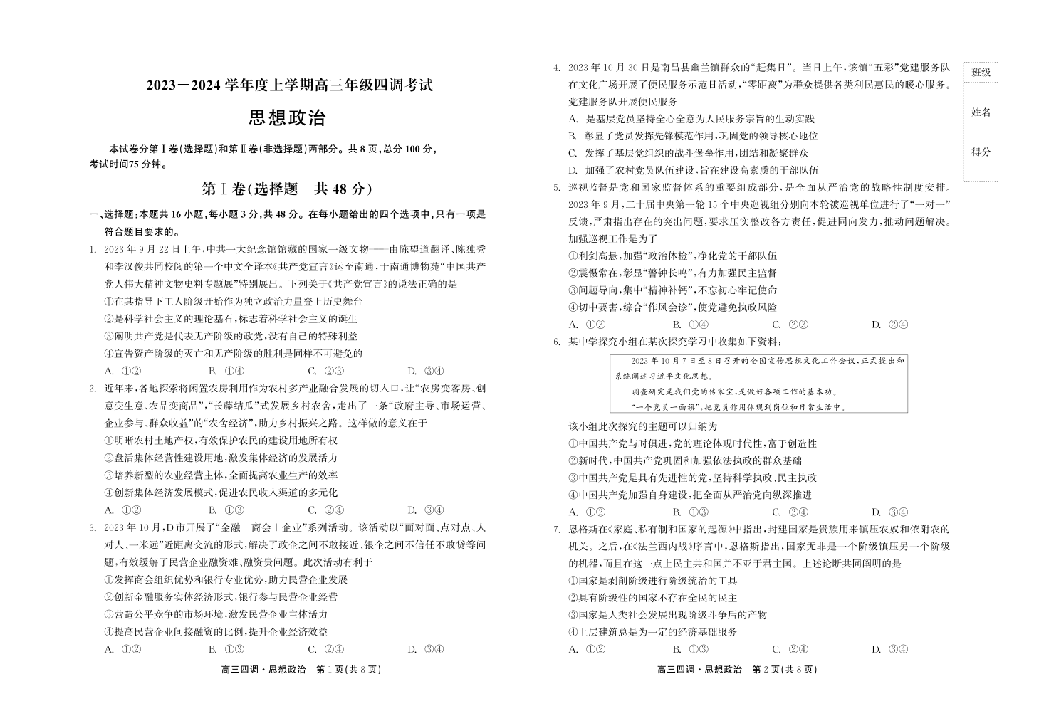 河北省衡水中学2024届高三上学期四调考试政治