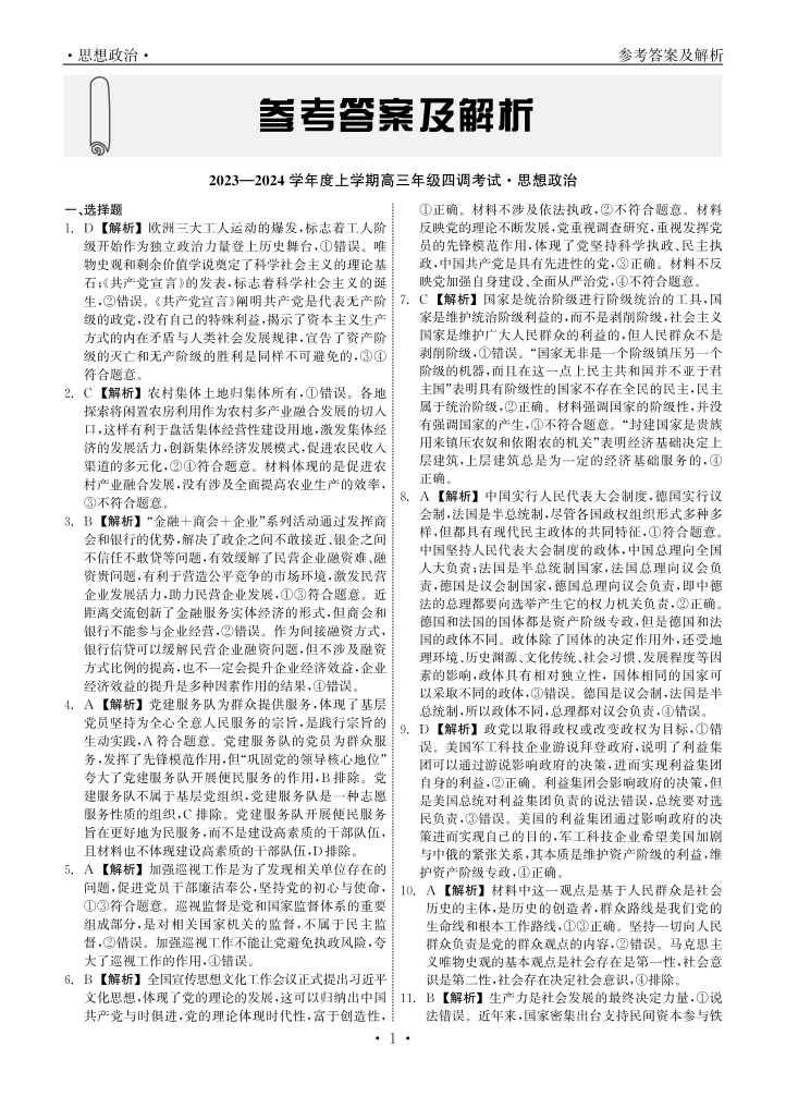 河北省衡水中学2024届高三上学期四调考试政治答案