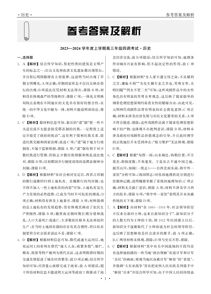 河北省衡水中学2024届高三上学期四调考试历史答案
