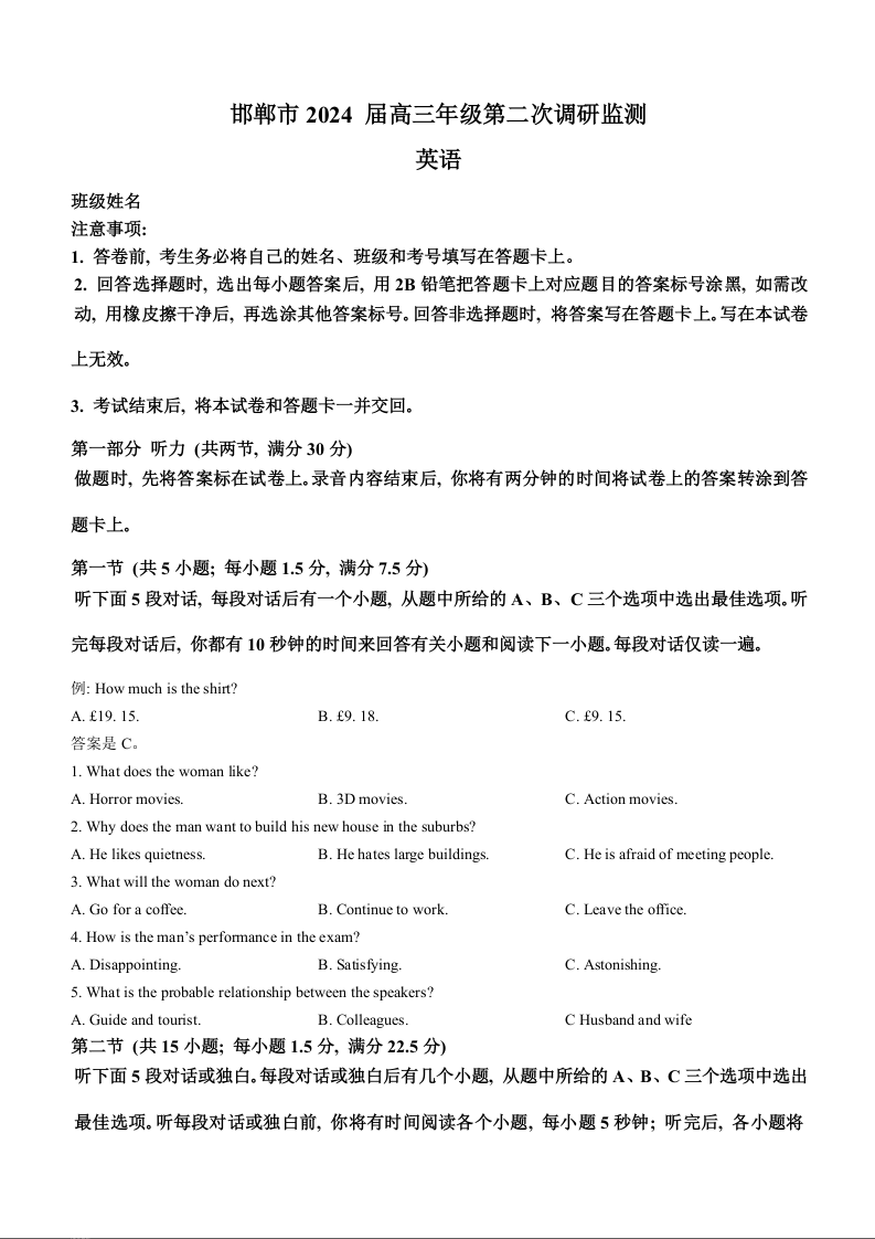 河北省邯郸市2024届高三上学期第二次调研监测英语