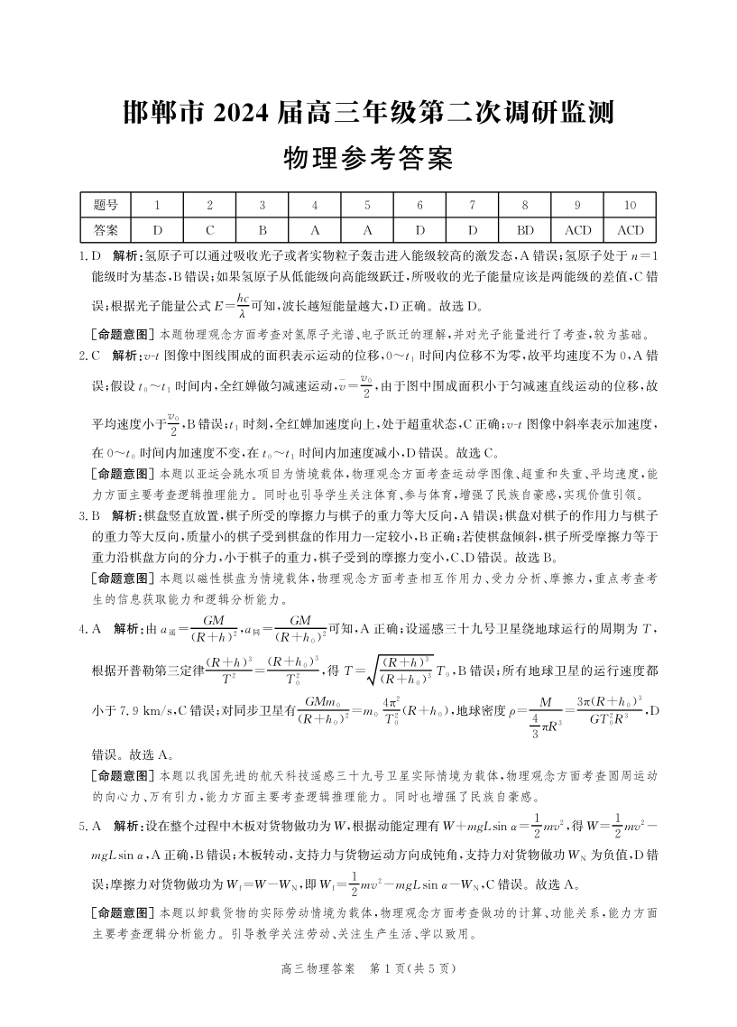 河北省邯郸市2024届高三上学期第二次调研监测物理答案