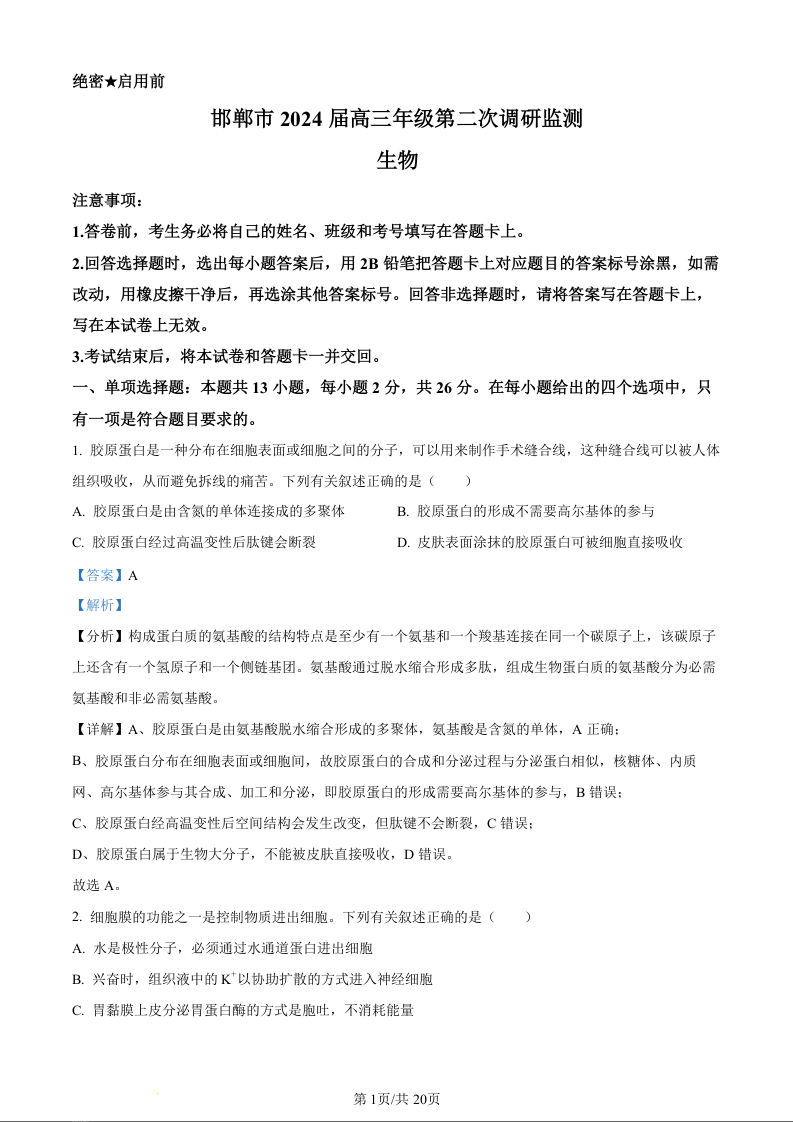 河北省邯郸市2024届高三上学期第二次调研监测生物(精品解析版)