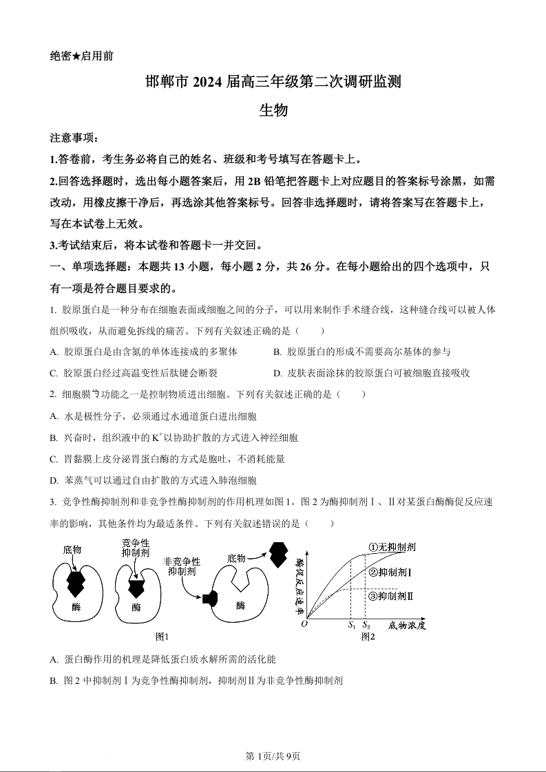 河北省邯郸市2024届高三上学期第二次调研监测生物(原卷版)