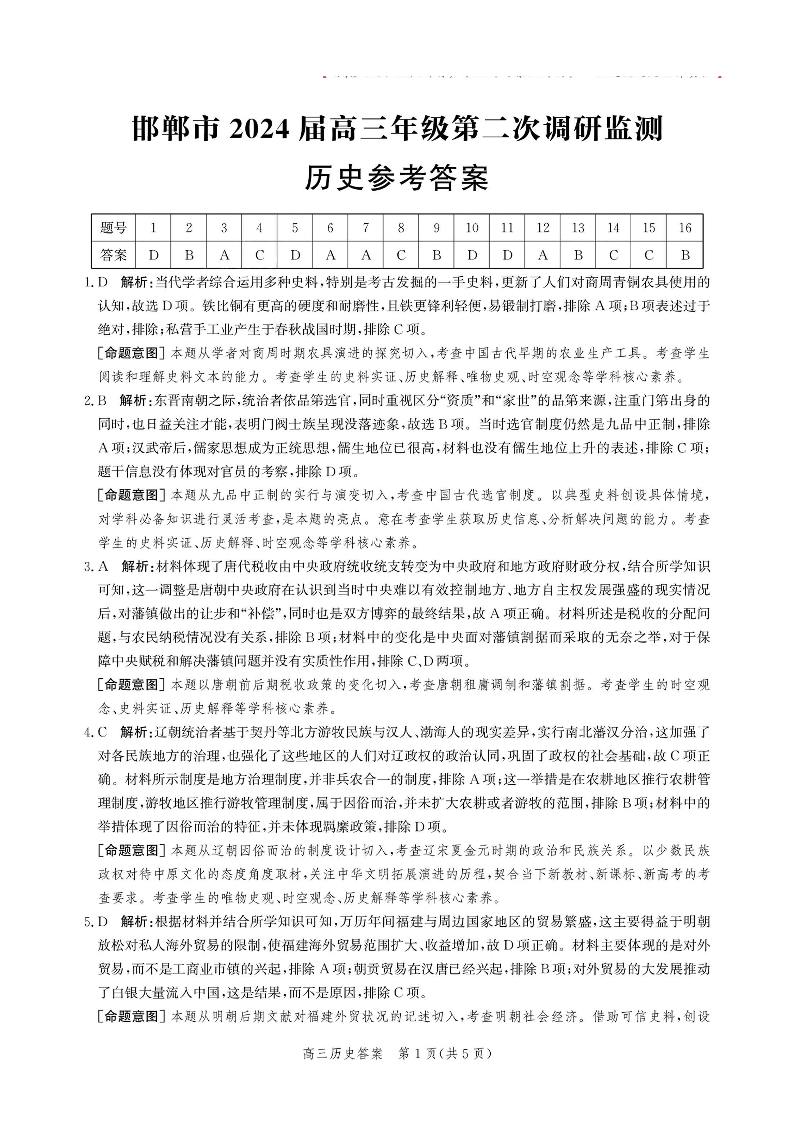 河北省邯郸市2024届高三上学期第二次调研监测历史答案