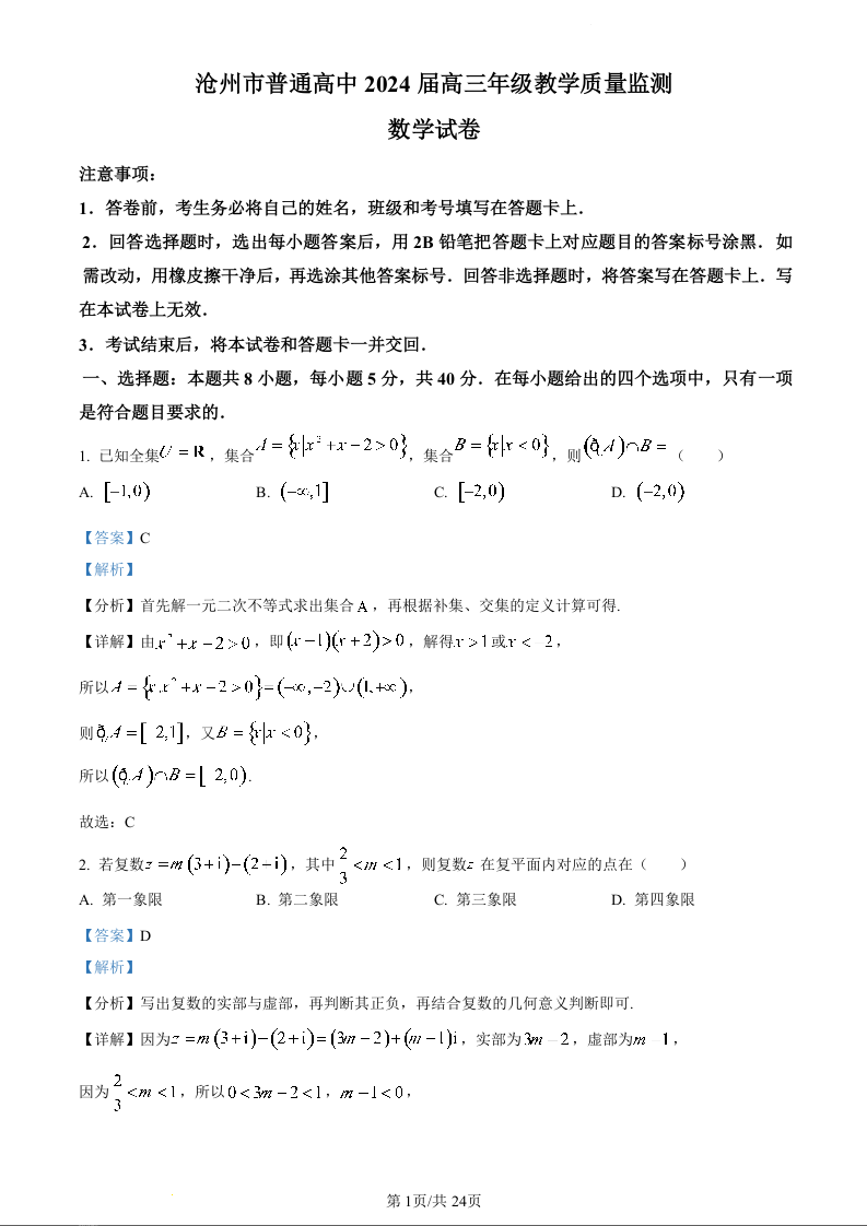 河北省沧州市2024届高三上学期12月月考数学(精品解析版)