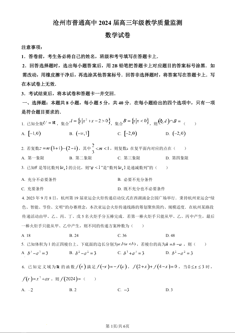 河北省沧州市2024届高三上学期12月月考数学(原卷版)