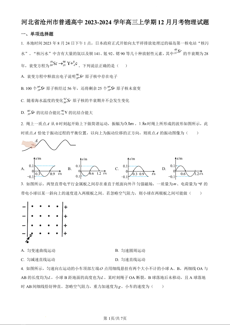 河北省沧州市2024届高三上学期12月月考物理(原卷版)