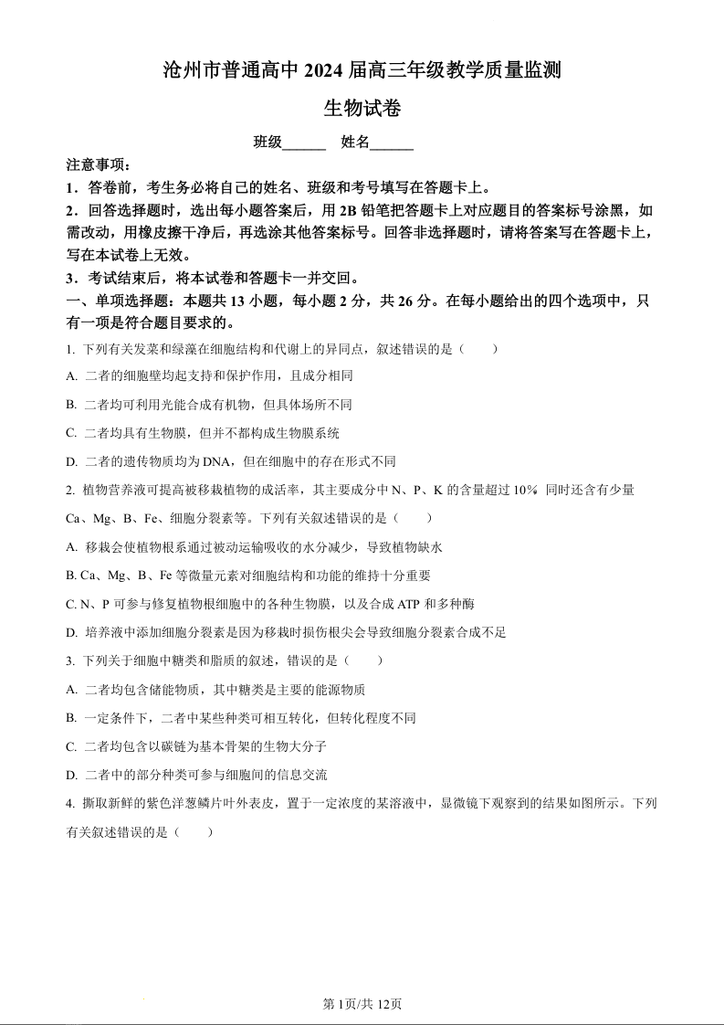 河北省沧州市2024届高三上学期12月月考生物+答案