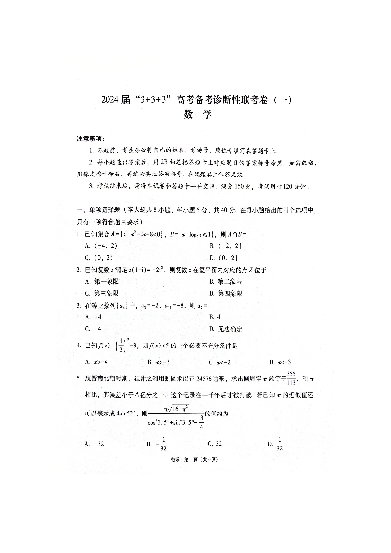 2024届贵州省“3+3+3”高考备考诊断性联考卷(一)数学