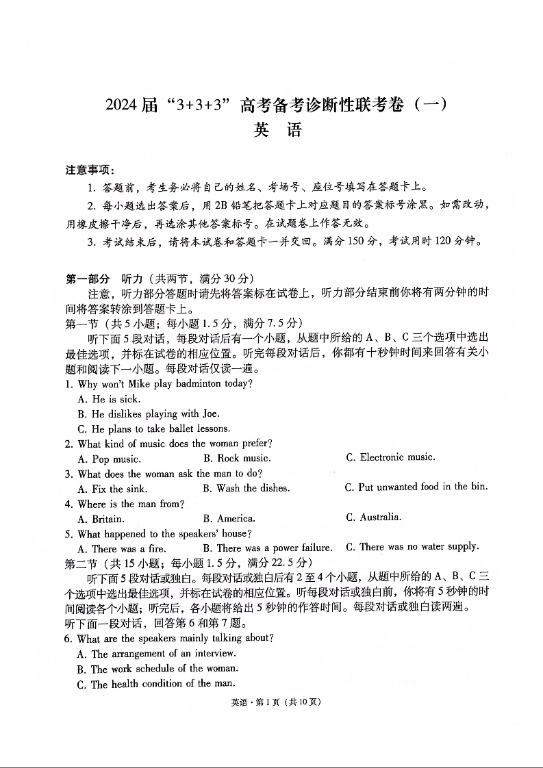贵州省2024届“3+3+3”高考备考诊断性联考卷(一)英语