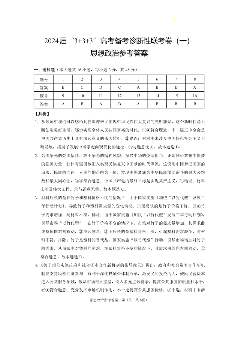 贵州省2024届“3+3+3”高考备考诊断性联考卷(一)政治答案